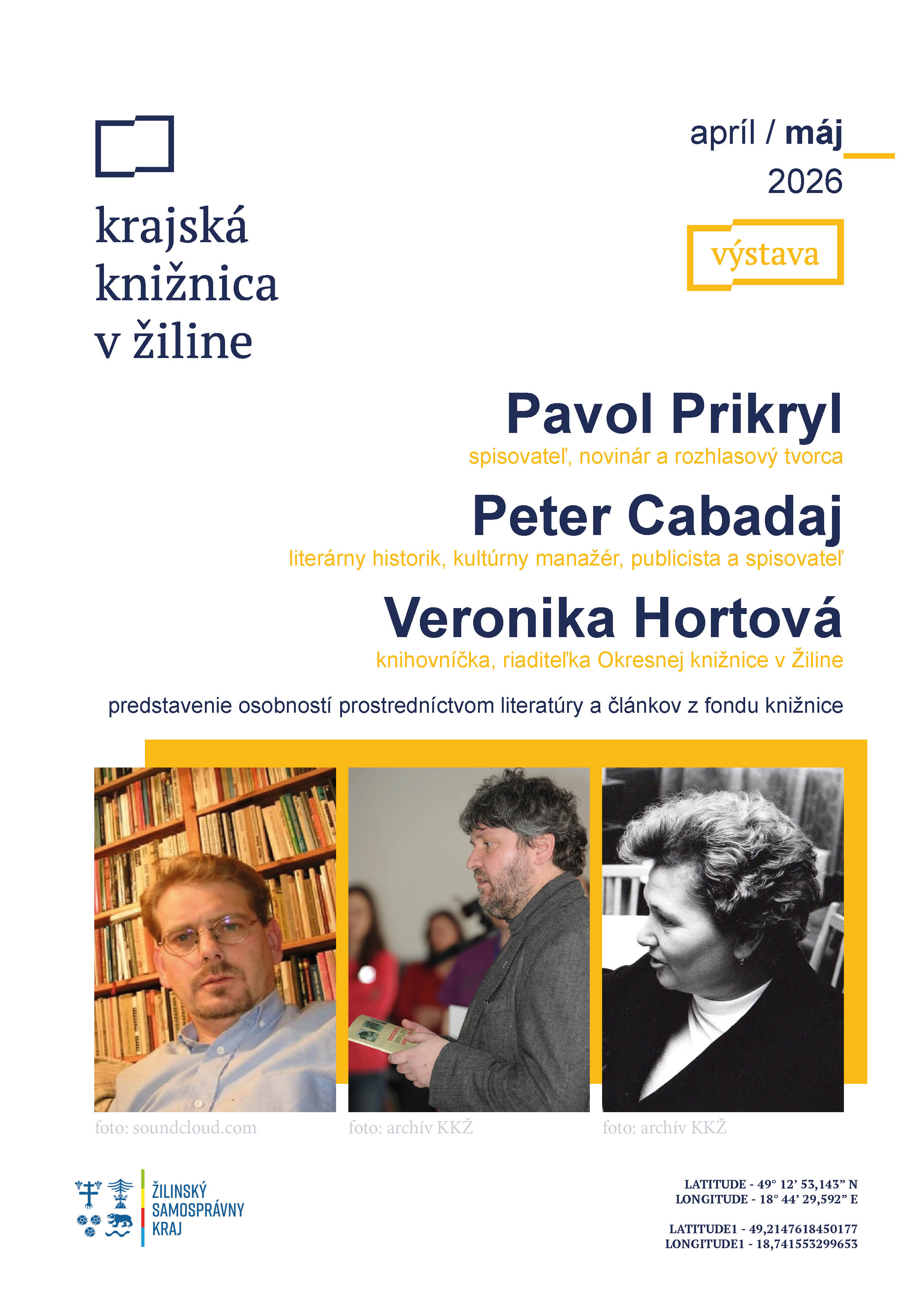 Prostredníctvom literatúry a článkov z fondu Krajskej knižnice v Žiline Vám predstavíme život a tvorbu troch významných osobností, ktoré sú úzko späté s našou knižnicou a regiónom Horné Považie. Výstava bude prístupné od 1. apríla do 30. mája 2026 na prízemí Krajskej knižnice v Žiline.