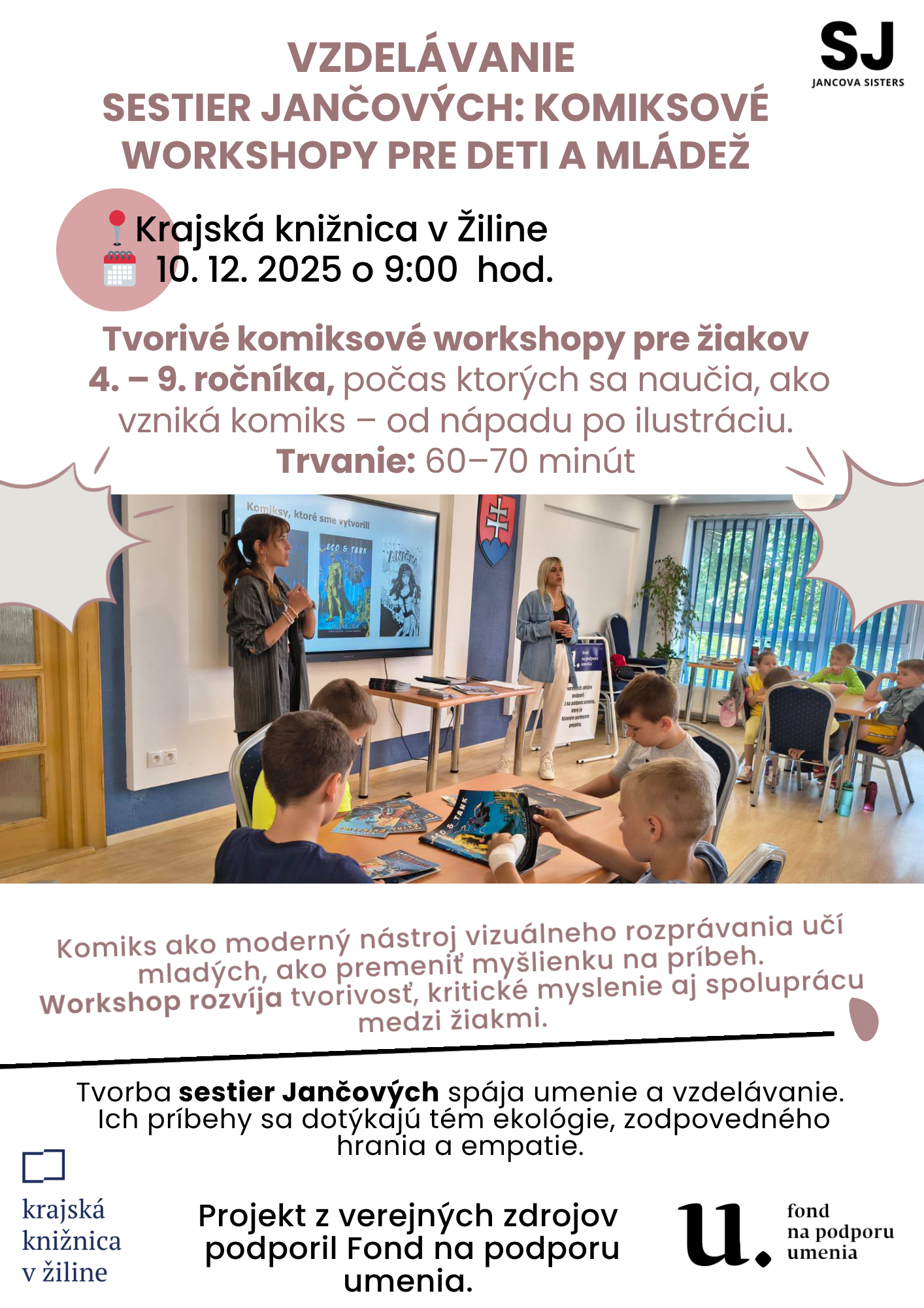 Krajská knižnica v Žiline srdečne pozýva žiakov 2. stupňa základných škôl (4. – 7. ročník) na prezentačno-vzdelávacie podujatie so sestrami Ivanou a Zuzanou Jančovými v stredu 10. decembra 2025 o 9:00. Žiaci sa dozvedia, ako vzniká komiks – od nápadu cez scenár až po ilustráciu. Sestry Jančové predstavia aj publikácie Eco a tank (téma eko), Čiernovlasý princ(téma diskriminácie), pripravované tituly o Messim, Ronaldovi a Mbappém atď. a hlavnou témou bude nová komiksová novinka „Tank a spol. – Detektívi ekologických záhad“, zameraná na ekologické vzdelávanie a zodpovedný prístup k životnému prostrediu hravou nenáročnou formou tvorby eko-komiksu počas kreatívnej časti.