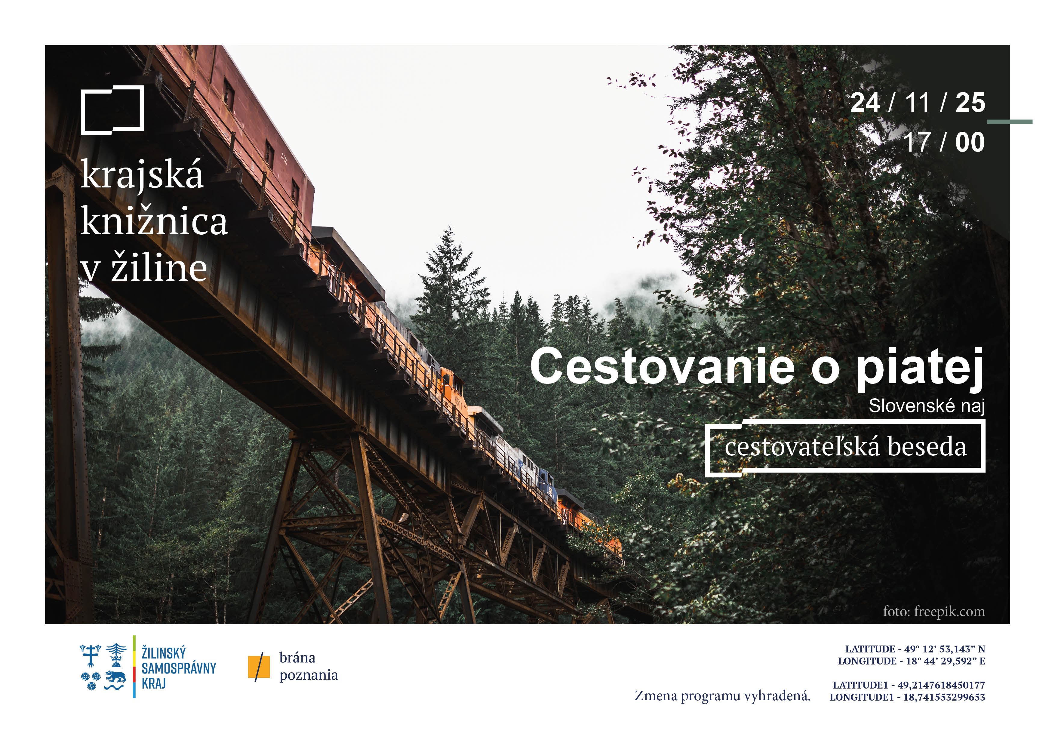 plagátV čom sme ako krajina jedinečný? A čo jedinečné máme vo svojej krajine? V ktorom slovenskom meste sa nachádza najvyššia kostolná veža? Ktoré slovenské mesto má najväčšie štvorcové námestie? Kde je najvyšší priemer zrážok na Slovensku za kalendárny rok? Kde máme najväčšiu ZOO na Slovensku? V ktorom meste na Slovensku sa nachádza najstarší európsky verejný park? Ktorá dodnes funkčná lesná železnica je jedinečná svojho druhu v Európe? Tieto a mnohé ďalšie otázky si zodpovieme na ďalšom stretnutí 24. novembra o 17:00 v Krajskej knižnici v Žiline.