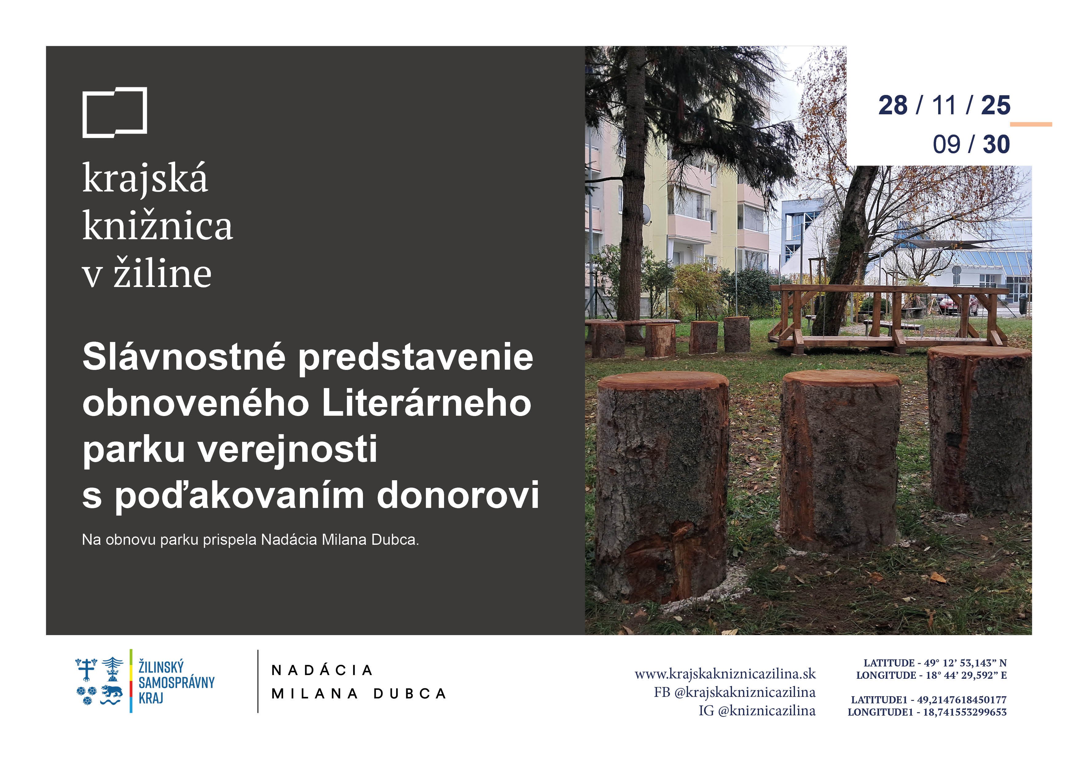 Vďaka Nadácii Milana Dubca Krajská knižnica v Žiline ukončila revitalizáciu Literárneho parku, v ktorom pribudli nové stromy, okrasné kríky, kvetinový pás cibuľovín, herné a pohybové prvky pre deti, oddychové zóny s lehátkami, tieniace plachty a prírodné detské ihrisko.