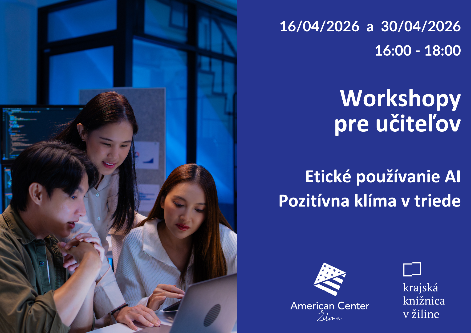 Pre obmedzený počet miest je potrebné sa vopred prihlásiť emailom na zilina@americanspaces.sk Prihlásiť sa môžete na každý workshop samostatne, alebo naraz na oba.