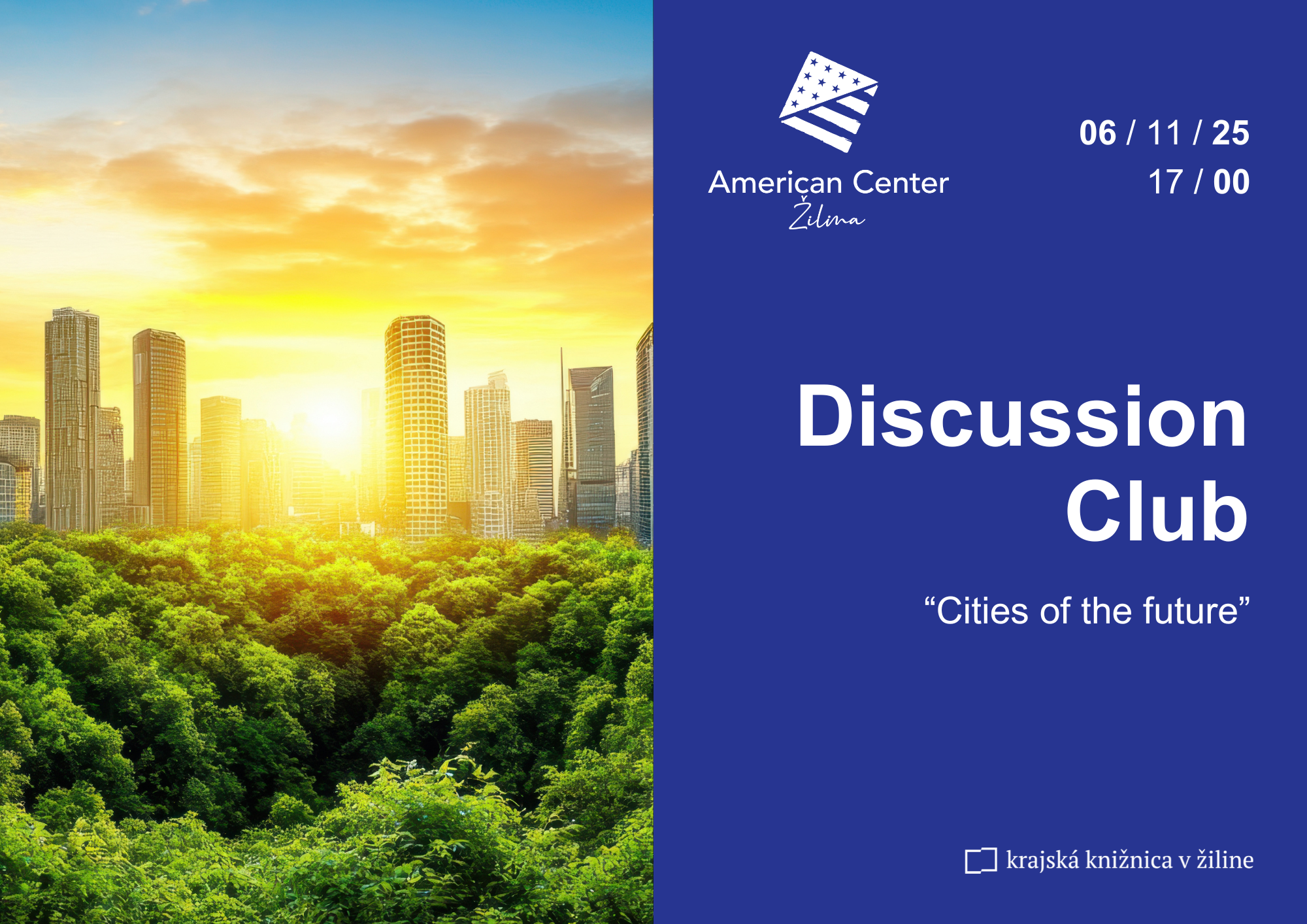 The discussion club will meet on Thursday November the 9th at 5pm and we will be talking about the Cities of the future. Come and share your predictions and ideas about how urbanism should evolve. We look forward to seeing you at the American Center Žilina.
