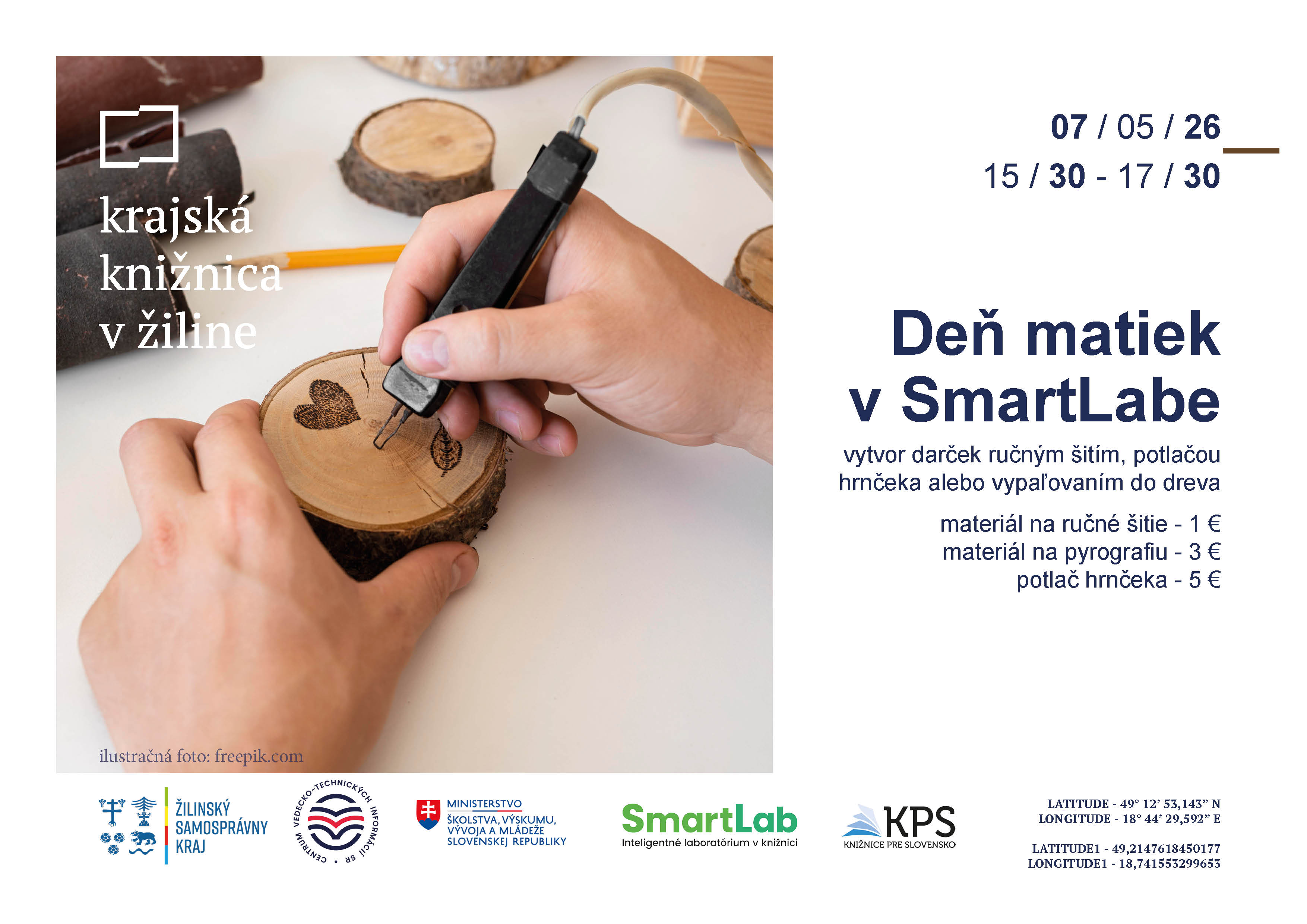 Rozmýšľate nad tým, ako prekvapiť a potešiť vašu mamu ku Dňu matiek? Príďte do Krajskej knižnice v Žiline vo štvrtok 7. mája o 15:30 a môžete si vybrať z tvorivých aktivít: vlastnú potlač šálky (originálny hrnček na obľúbený čaj; poplatok 5 €); pyrografiu – umelecké vypaľovanie vzorov do dreva (poplatok 3 €) alebo ručne ušiť srdce z lásky (poplatok 1 €) a vlastnoručne pripraviť prekvapenie.