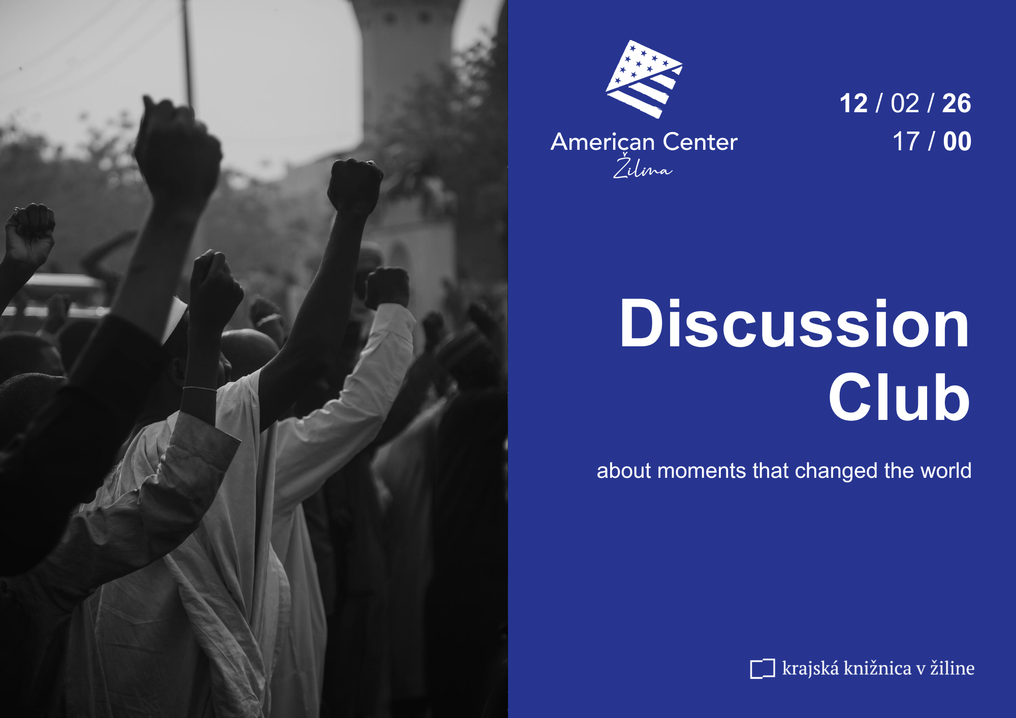 Topic of our February discussion club will be moments that changed the world. Come and talk with us about inventions we can’t imagine our lives without, historical events that influence the present, or about records broken by extraordinary people. We’ll meet on Thursday 15th of January 2026 at 5pm in American Center Žilina.