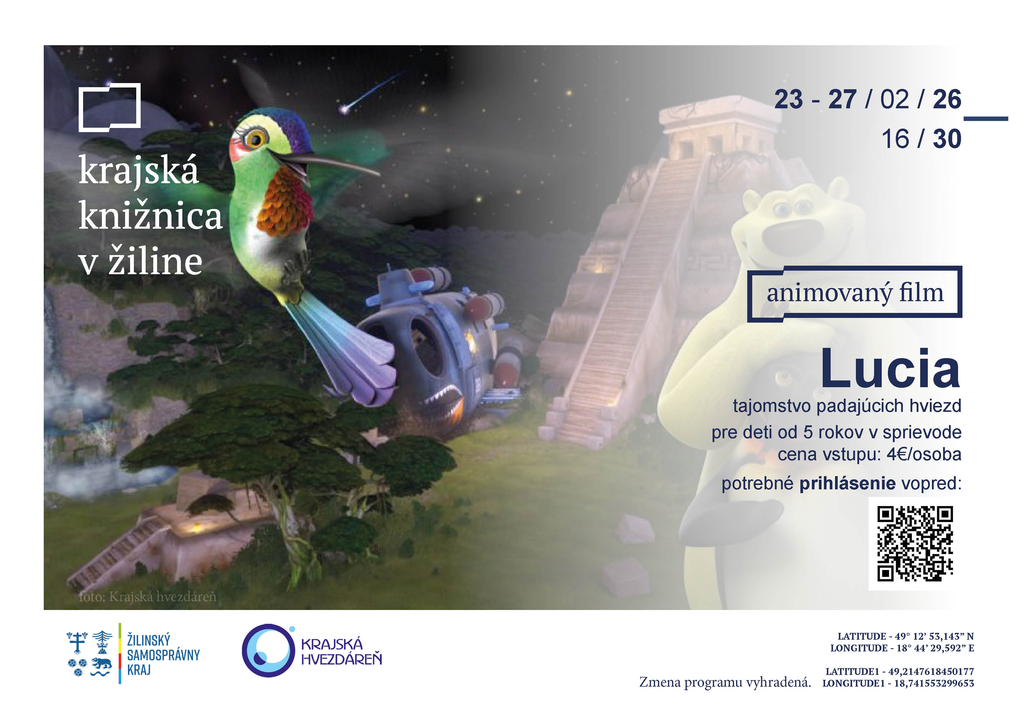 Krajská knižnica v Žiline v spolupráci s Krajskou hvezdárňou v Žiline pozývajú deti na jedinečný zážitok v planetáriu. Záujemcovia sa v planetáriu môžu tešiť na astronomickú rozprávku a aktuálnu hviezdnu oblohu nad Žilinou s výkladom lektora a komentovanú prehliadku aktuálnej večernej hviezdnej oblohy. Počas jarných prázdnin sme pripravili tri premietania pre deti od 5 rokov v sprievode rodičov/starých rodičov, ktoré hravou a zrozumiteľnou formou priblížia tajomstvá vesmíru. Cena jedného vstupu: 4€/osoba (deti aj dospelí). Na jednotlivé podujatia je potrebné sa vopred prihlásiť prostredníctvom formulárov (viď nižšie).