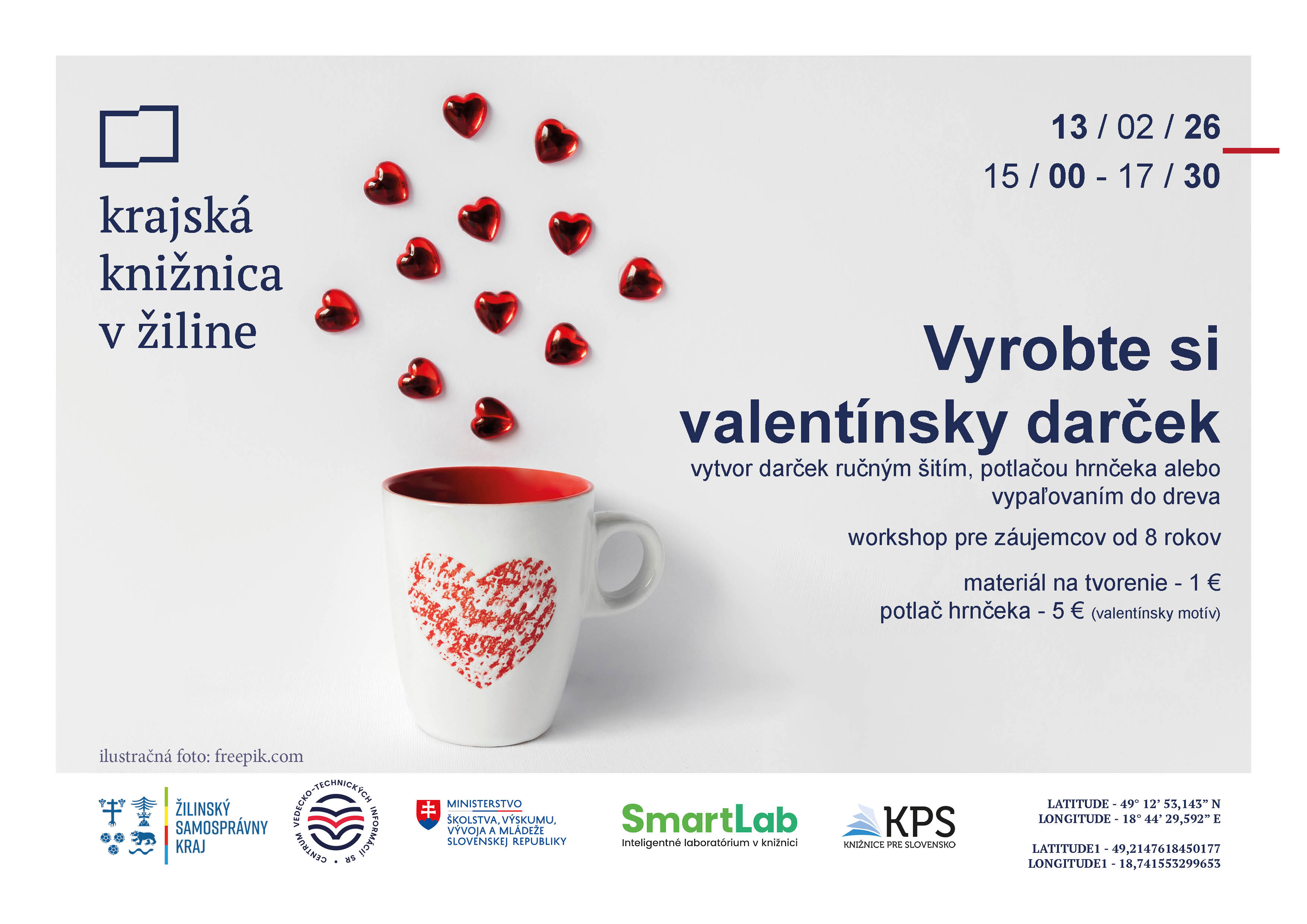 Neviete, čo darovať na Valentína? Zaujíma vás ako si vyrobiť zaujímavý valentínsky darček? Príďte si užiť tvorivé popoludnie v piatok 13. februára od 15:00 do 17:30 do Krajskej knižnice v Žiline a odnesiete si originálne darčeky. Môžete sa tešiť na tvorenie valentínskych darčekov ručným šitím, potlač hrnčekov a vypaľovanie do dreva. Čaká vás uvoľnená atmosféra, kreatívne dielne a inšpiratívne prostredie.