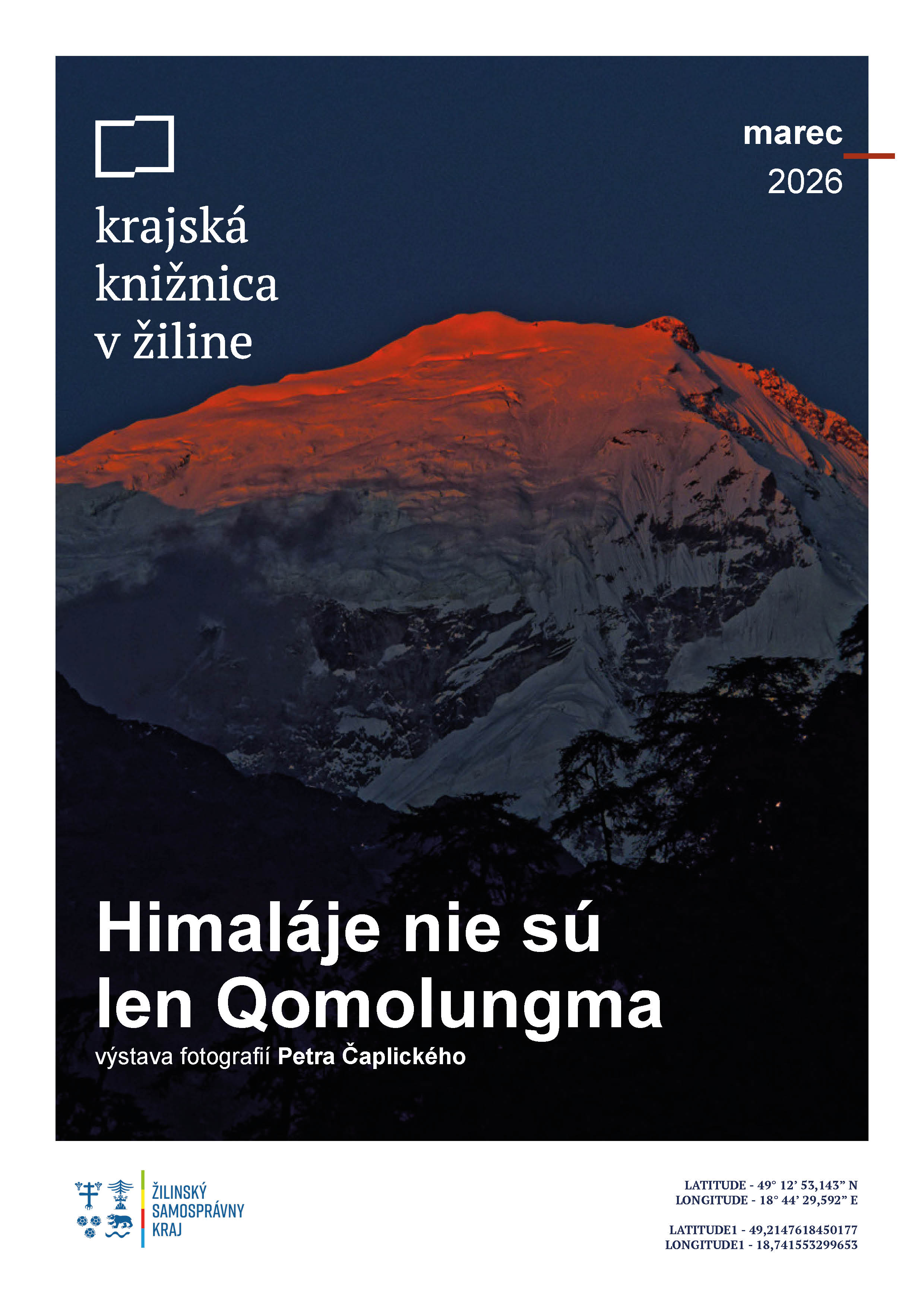 Himaláje nie sú len Qomolungma – výstava bude zameraná na fotografie z oblasti vysokých Himalájí, ako aj historických miest Nepálu, ktoré ukazujú nielen dych berúce scenérie najvyšších končiarov sveta, ale aj ťažký život horských národov žijúcich v týchto oblastiach a ich fascinujúcu kultúru. Jej autorom je spisovateľ, cestovateľ, fotograf a horolezec Peter Čaplický, ktorý sa organizačne podieľal aj na účasti slovenskej výpravy na paralympijských hrách. Vernisáž výstavy sa uskutoční po besede vo štvrtok 5. marca.