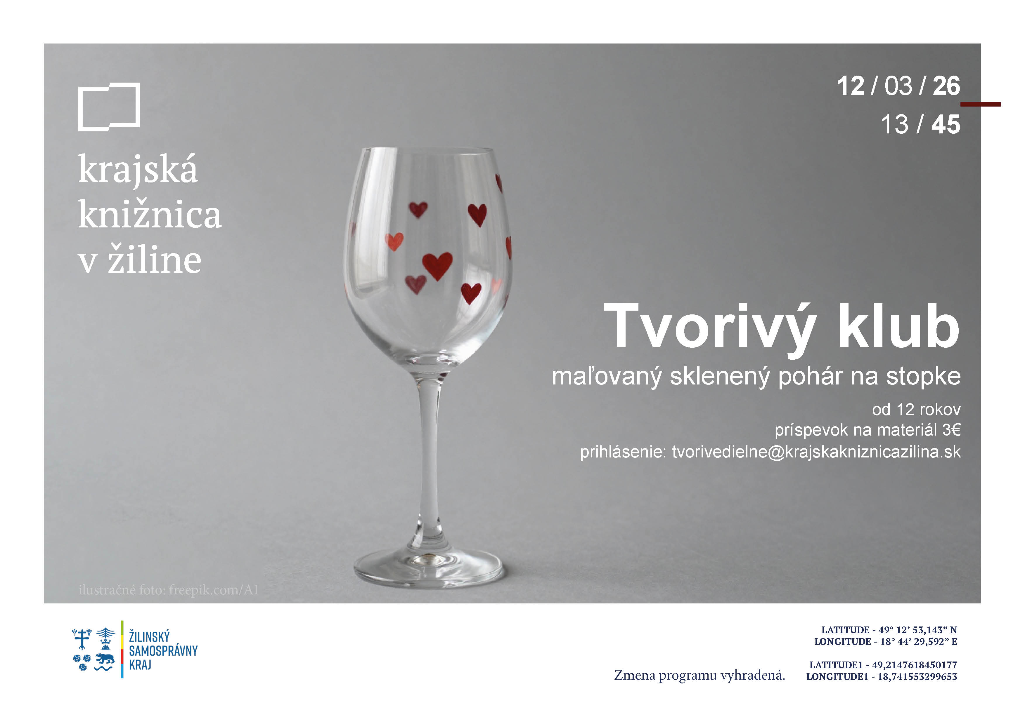 Sklenené poháre na stopke ponúkajú nekonečné možnosti pre kreatívne projekty a ich maľovanie ich môže premeniť na úžasné dekoratívne kúsky. 12. marca 2026 o 13:45 si s trochou úsilia môžete vytvoriť svoj vlastný dizajn, ktorý vám zostane ako nádherná pamiatka na nezabudnuteľné momenty, alebo ako skvelý darček. Na výber budú farby na sklo a akrylové farby. Podujatie je vhodné pre všetkých záujemcov od 12 rokov.
