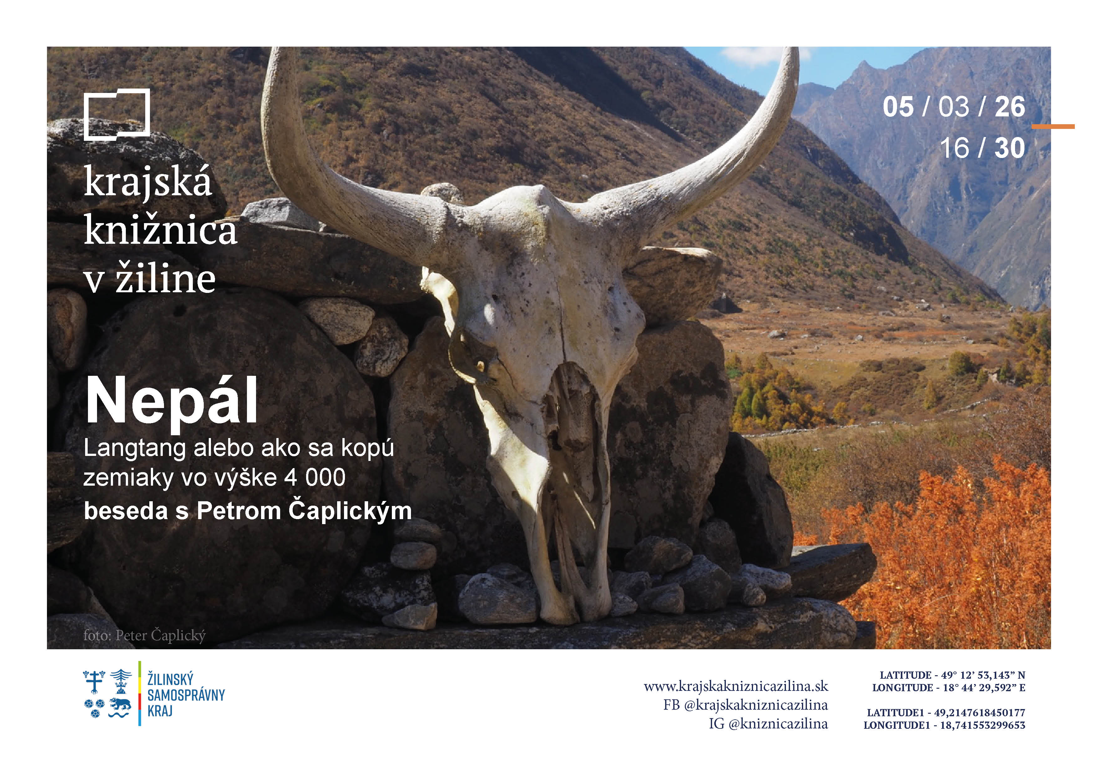 Nepál – Langtang alebo ako sa kopú zemiaky vo výške 4 000 m – beseda Pozývame vás na besedu s Petrom Čaplickým, ktorá sa uskutoční vo štvrtok 5. marca o 16:30 v Krajskej knižnici v Žiline. Trek v oblasti Langtang patrí medzi najkrajšie v oblasti vysokých Himalájskych končiarov. Okrem úžasných výhľadov a krásneho výstupu vie pripraviť aj prekvapenia, ktoré by v tejto výške nikto neočakával. Príďte si vypočuť nezabudnuteľné zážitky z majestátnych hôr prostredníctvom rozprávania, osobných zážitkov a fotografií. (Beseda sa koná v rámci Týždňa slovenských knižníc 2026)