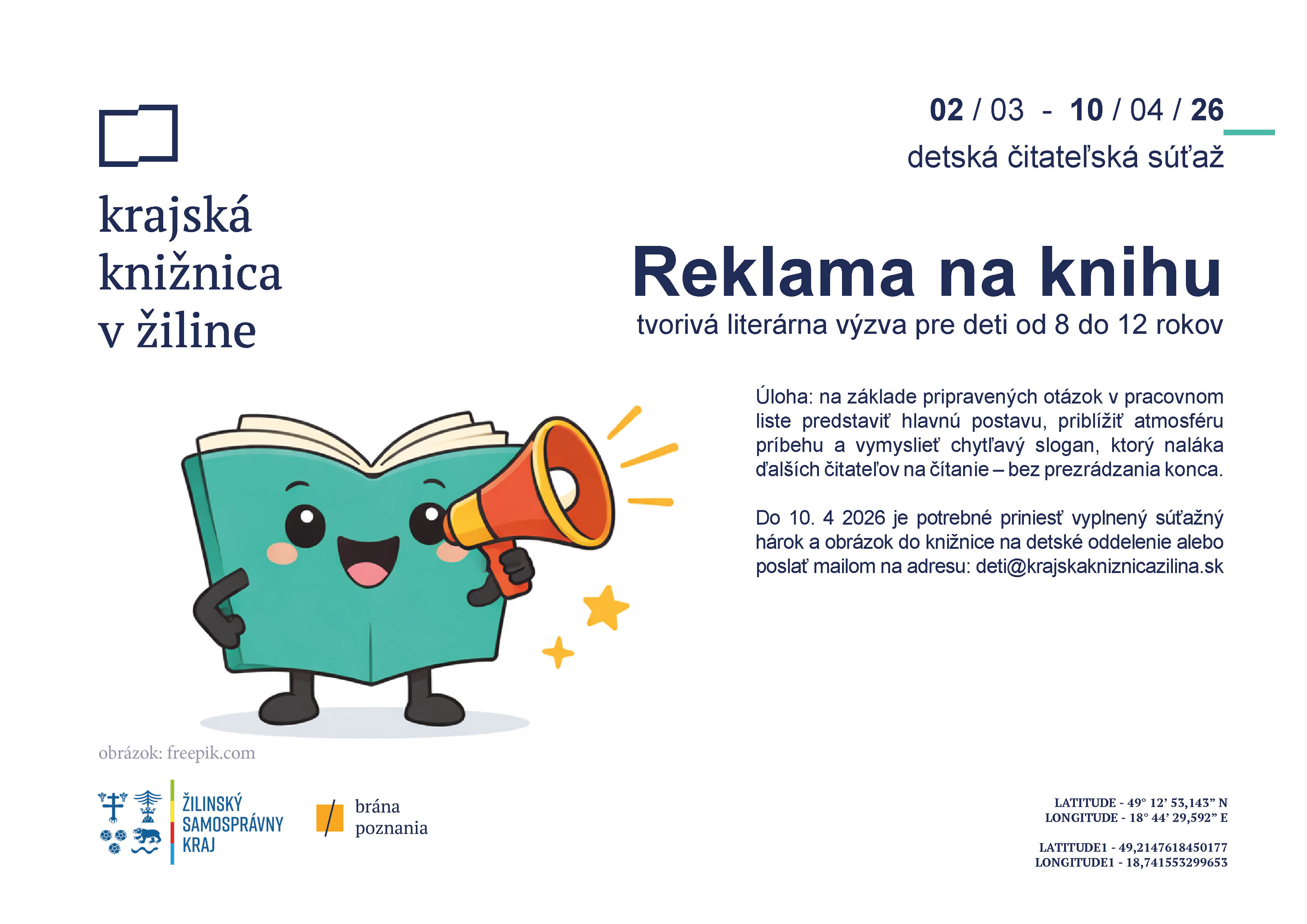 Čitateľská súťaž prebieha od 2. marca 2026 do 10. apríla 2026. Do tohto dátumu je potrebné priniesť vyplnený súťažný hárok a obrázok do knižnice na detské oddelenie alebo poslať mailom na adresu: deti@krajskakniznicazilina.sk