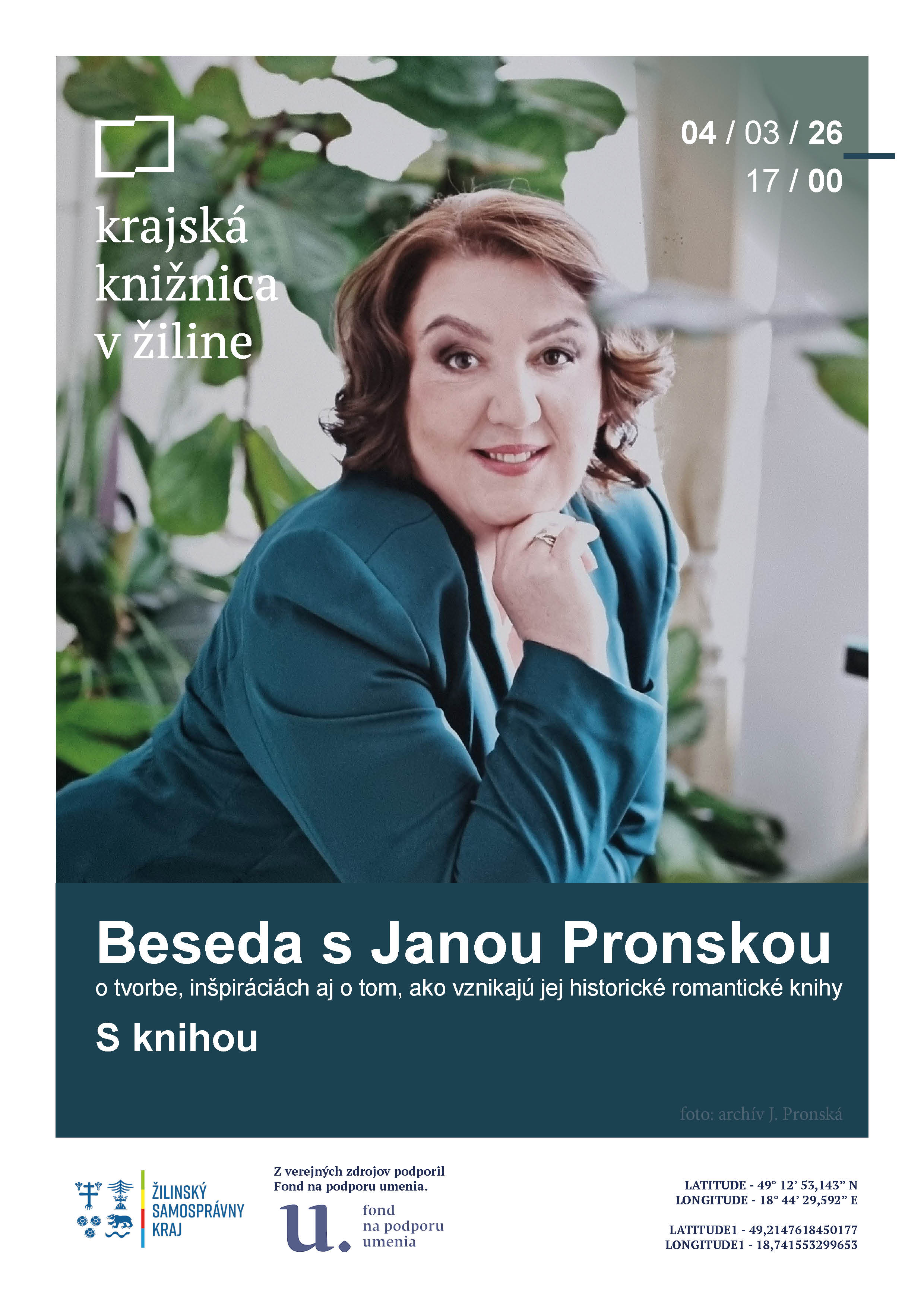Pozývame vás na besedu s Janou Pronskou, 4. marca o 17:00, jednou z najčítanejších slovenských autoriek historickej romantickej literatúry. Vo svojich knihách ako Kliatba, Zakliata panna, Princezná z Izmiru, Dáma z hradu či Pútnik a jeho láska spája históriu, silné ženské postavy a pútavé príbehy. Na besede porozpráva o svojej tvorbe, inšpiráciách aj o tom, ako jej knihy vznikajú. Príďte na príjemné stretnutie s autorkou, ktorú poznáte z kníh.