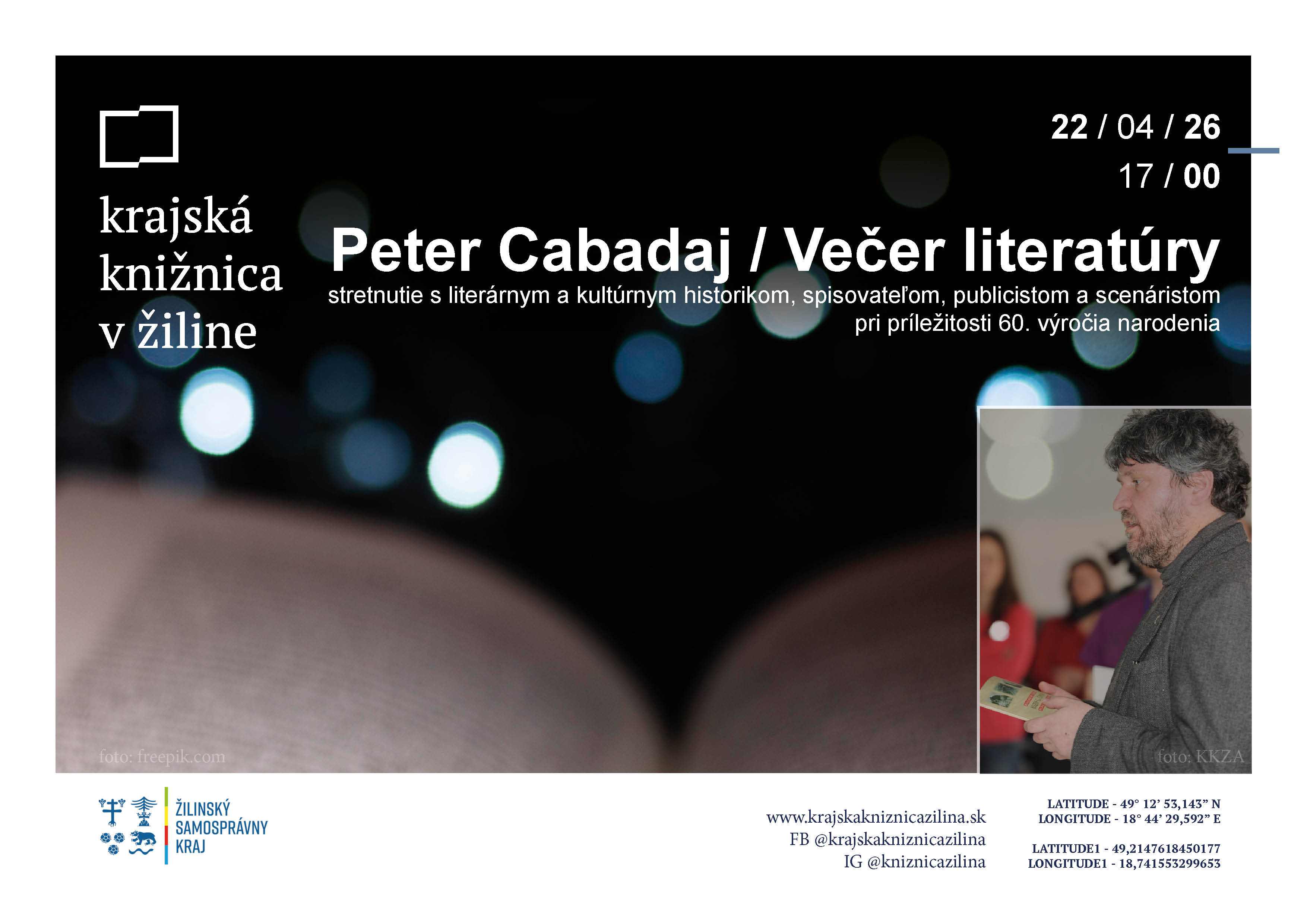 Pozývame na stretnutie s literárnym a kultúrnym historikom, spisovateľom, publicistom, scenáristom a manažérom kultúry Petrom Cabadajom v stredu 22. apríla o 17:00 v Krajskej knižnici v Žiline. Peter Cabadaj je významná osobnosť slovenskej literatúry a kultúry. Venuje sa výskumu literatúry a kultúry s osobitným dôrazom na slovenský exil a biografistiku. Zaoberá sa však aj súčasnou slovenskou literárnou tvorbou a sám píše a vydáva. Je súčasťou mnohých výskumných i výstavných projektov v celoslovenskom i svetovom kontexte. Mnohostranné aktivity ukotvené v rodnom kraji z ktorého pochádza ho predurčili k tomu, aby bol súčasťou veľkolepých kultúrnych i duchovných projektov /Cyrilometodské dni, Medzinárodný folklórny festival Jánošíkove dni v Terchovej, participácia na projekte, prostredníctvom ktorého bola Terchovská muzika zapísaná do Reprezentatívneho zoznamu nehmotného kultúrneho dedičstva ľudstva UNESCO a mnohých iných/. Významná je aj jeho dlhoročná práca na vydávaní a redigovaní obecných novín Terchová, ktoré založil.
