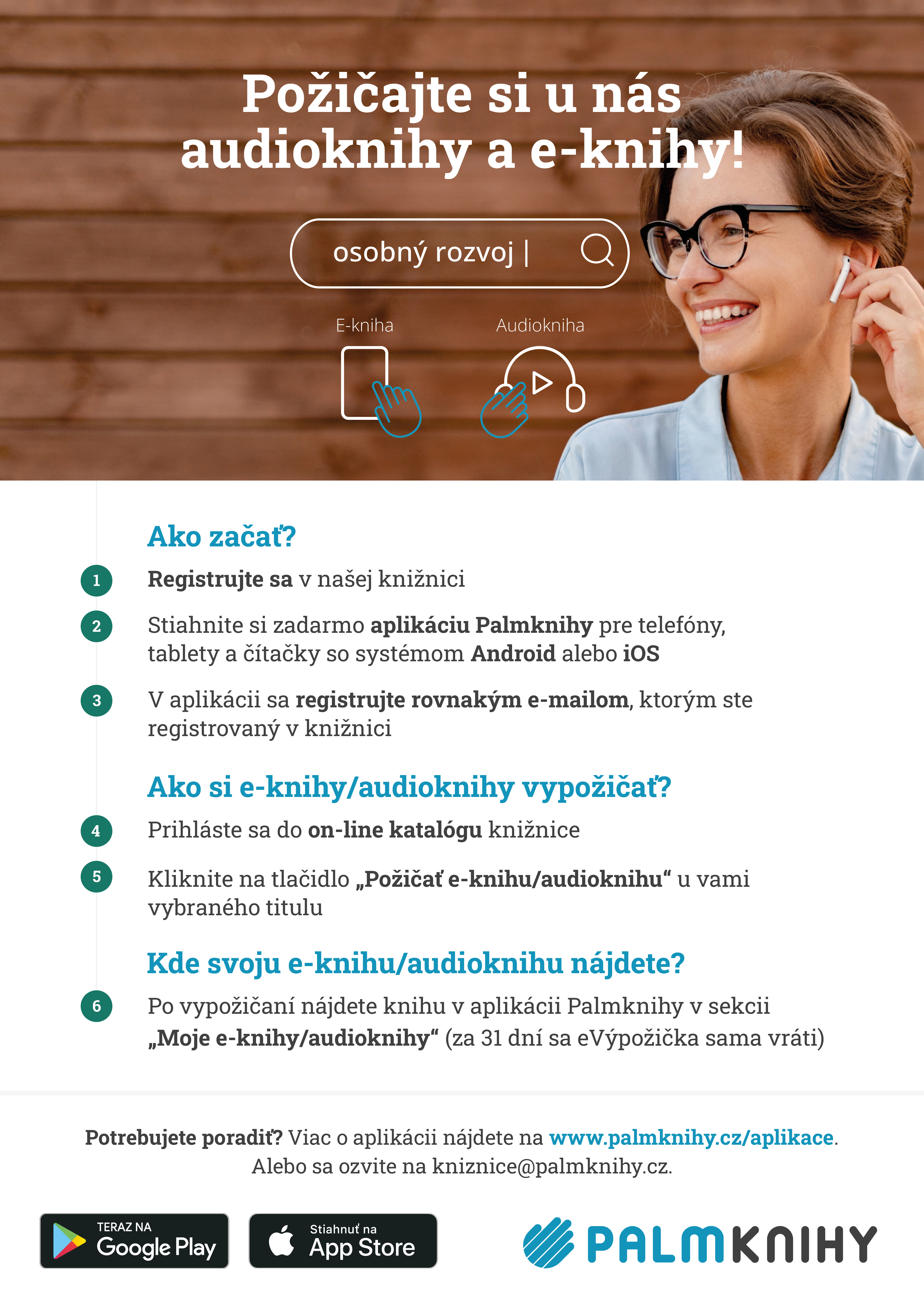Od 17. novembra 2025 Vám prinášame možnosť požičať si audioknihy opäť v spoluprácu s Palmknihy.cz. Čitatelia majú možnosť požičať si audioknihy z pohodlia domova, prostredníctvom online katalógu. Výpožičná doba je 30 dní, súčasne môžete mať požičané 5 audiokníh/e-kníh, každá audokniha je vypožičaná za poplatok 1,80€.