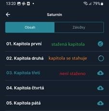 - pri každej kapitole je zobrazený symbol identifikujúci jej stav (stiahnutá / sťahuje sa / je potrebné stiahnuť)